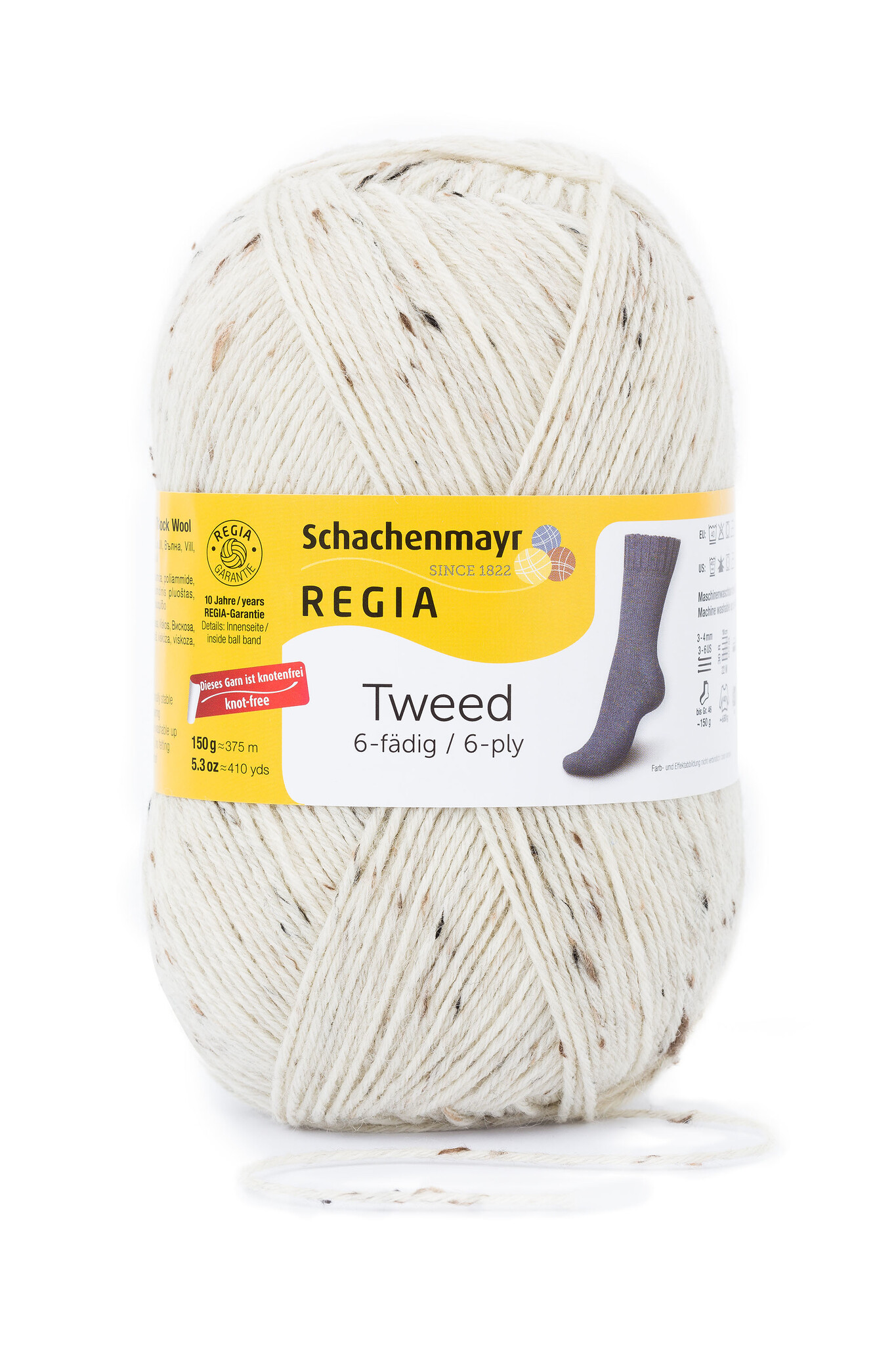 Jetzt wirds klassisch! REGIA Tweed eignet sich für alle, die einen rustikalen bis zeitlos schlichten Stil mit dem gewissen Extra mögen... Der Tweed-Effekt lockert die Naturtöne angenehm auf - besonders wirksam in Strukturmustern! Tweed-Socken im Zopfmuster machen sich zur Bluejeans ebenso gut wie zur Tracht! Das 6-fädige Garn ist formstabil, äußerst strapazierfähig, waschmaschinenfest bis 40° C, filzfrei und trocknergeeignet.